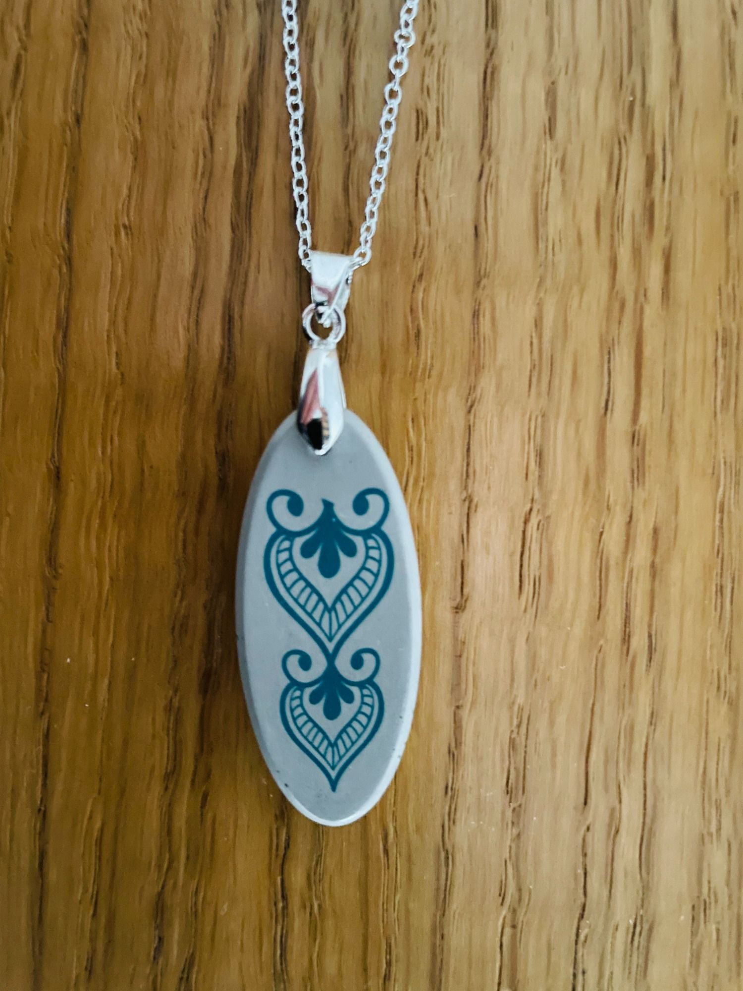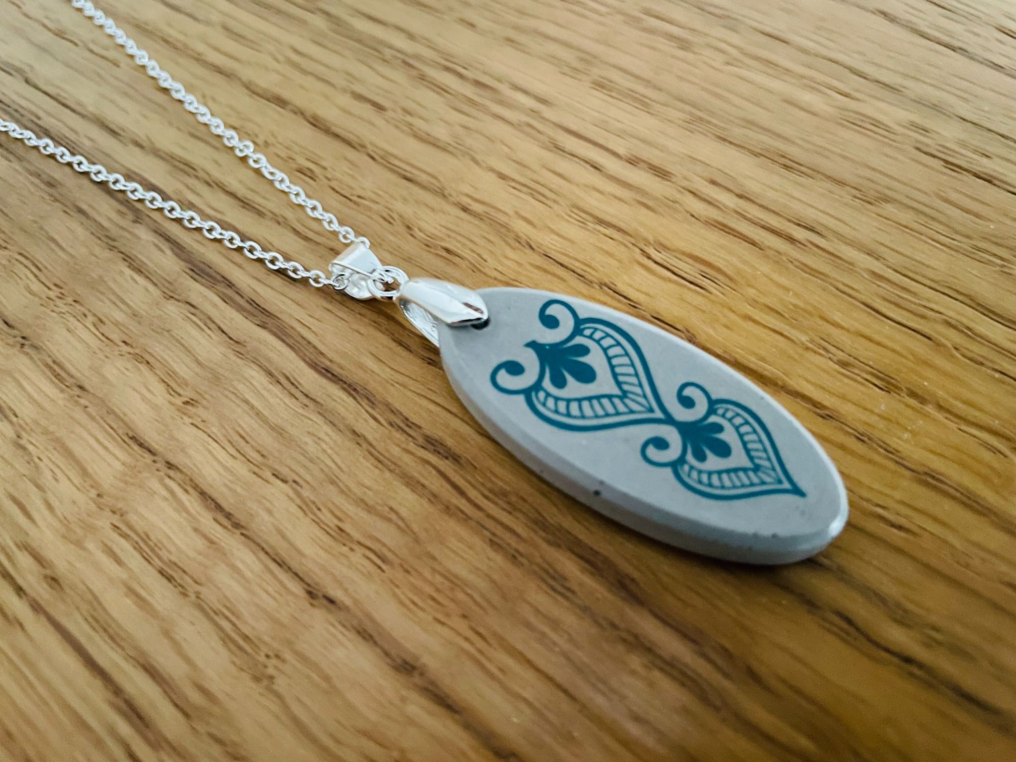 Artikelnummer: 2005 / Hauptmaterialien: Beton, Edelstahl, Kupfer / Maße: H ca. 3,8cm, B ca. 1,6cm / Kettenlänge 50cm / petrol, silberfarben