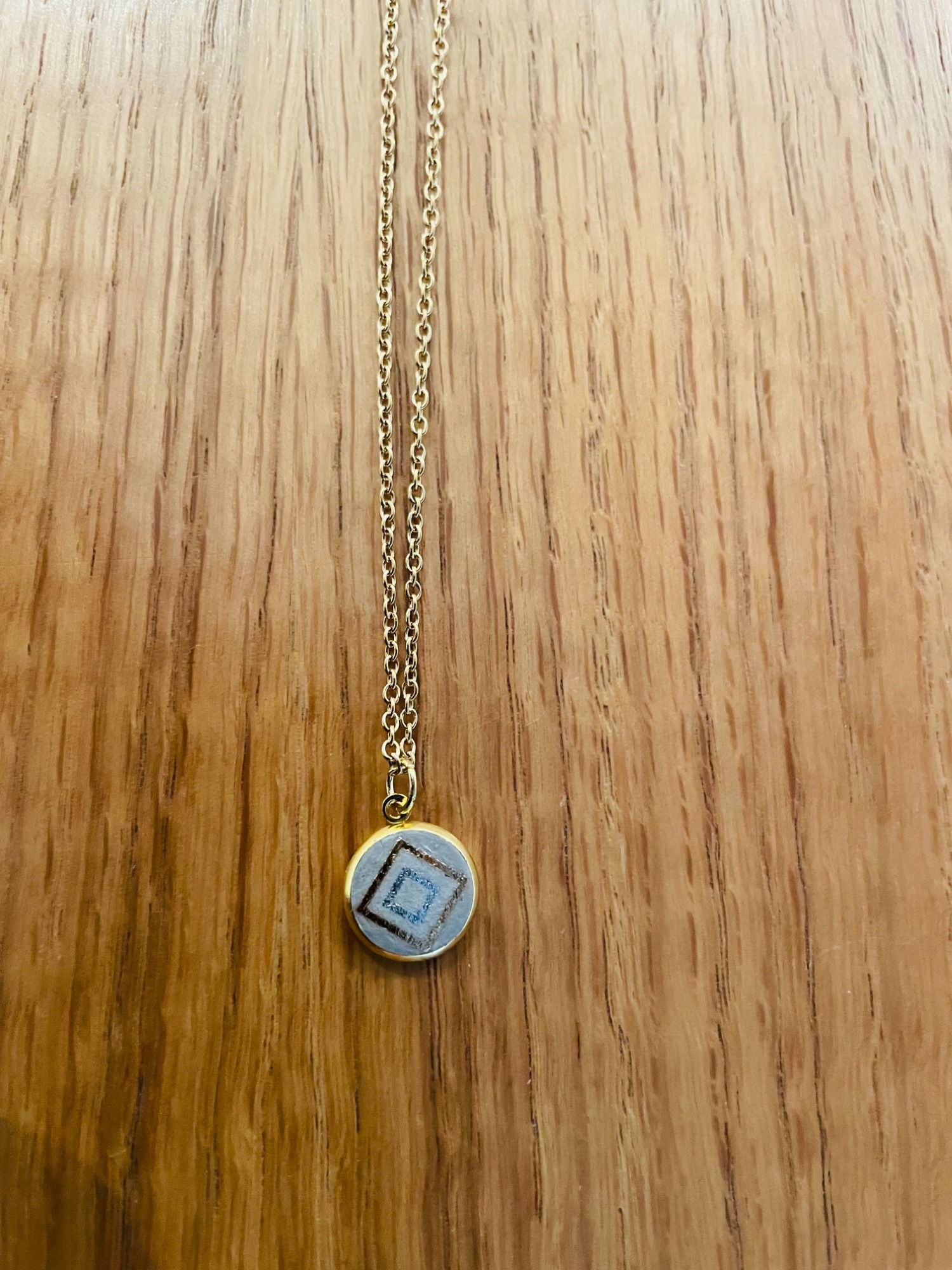 Artikelnummer: 2004 / Hauptmaterialien: Beton, Edelstahl, Kupfer / Maße: H ca. 3,8cm, B ca. 2,8cm / Kettenlänge 50cm / goldfarben